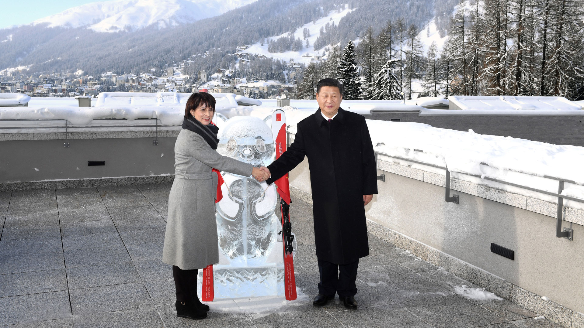1月17日,國家主席習(xí)近平同瑞士聯(lián)邦主席洛伊特哈德在達(dá)沃斯共同啟動(dòng)中瑞旅游年。兩國元首在熊貓冰雕像和印有中瑞兩國國旗及“中瑞旅游年”字樣的滑雪板旁合影留念。新華社記者 丁林 攝2017-01-18