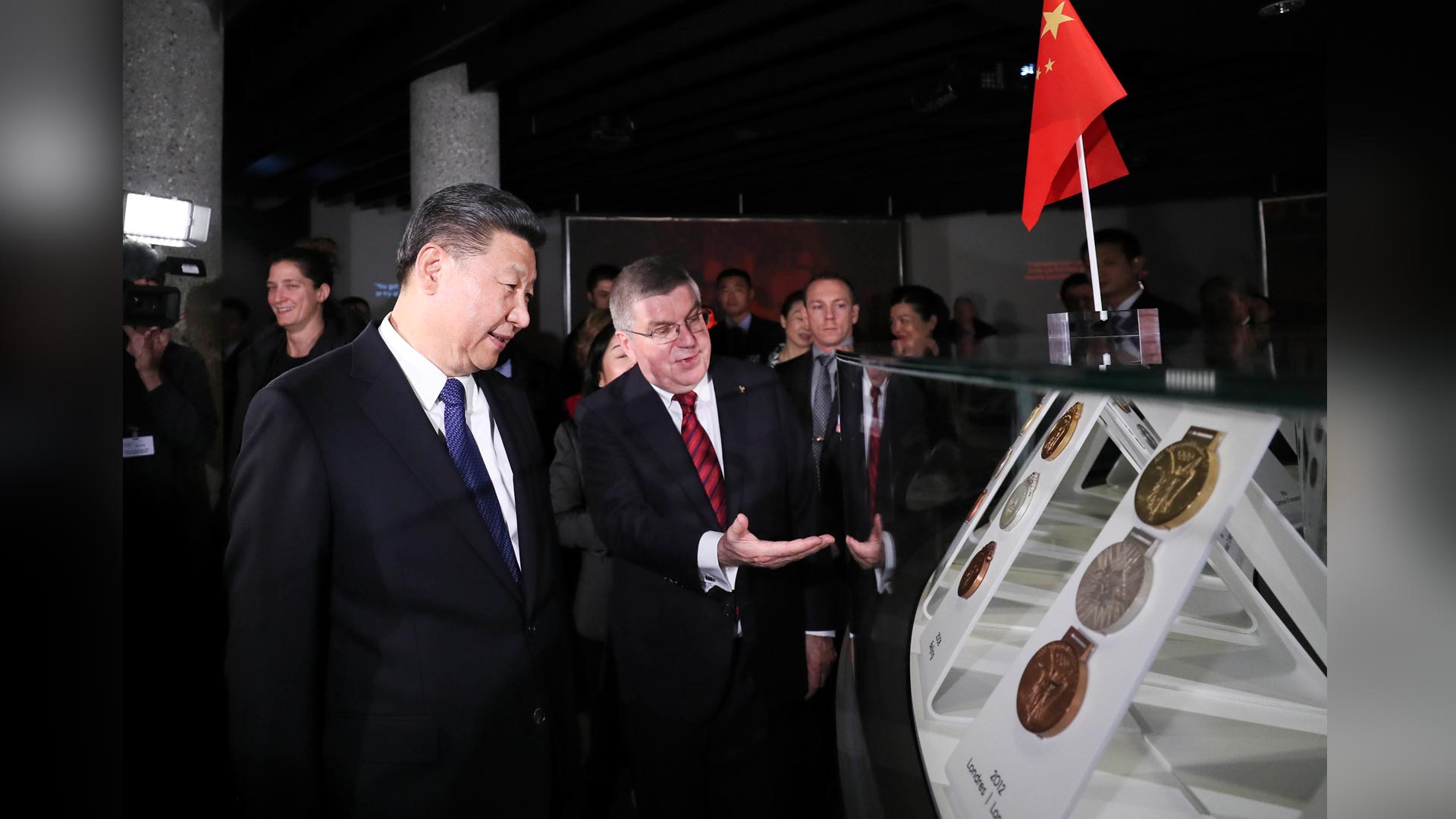 1月18日,國家主席習(xí)近平在瑞士洛桑國際奧林匹克博物館會(huì)見國際奧林匹克委員會(huì)主席巴赫。這是會(huì)見后,習(xí)近平在巴赫陪同下參觀往屆奧運(yùn)會(huì)獎(jiǎng)牌展。新華社記者 蘭紅光 攝2017-01-19