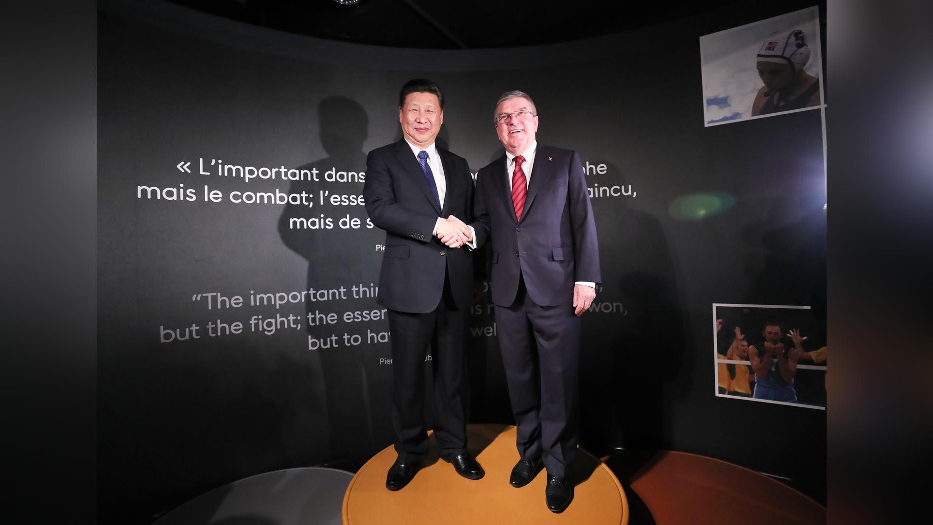 1月18日,國家主席習(xí)近平在瑞士洛桑國際奧林匹克博物館會(huì)見國際奧林匹克委員會(huì)主席巴赫。這是習(xí)近平和巴赫在奧運(yùn)冠軍領(lǐng)獎(jiǎng)臺(tái)上合影。新華社記者 蘭紅光 攝2017-01-19
