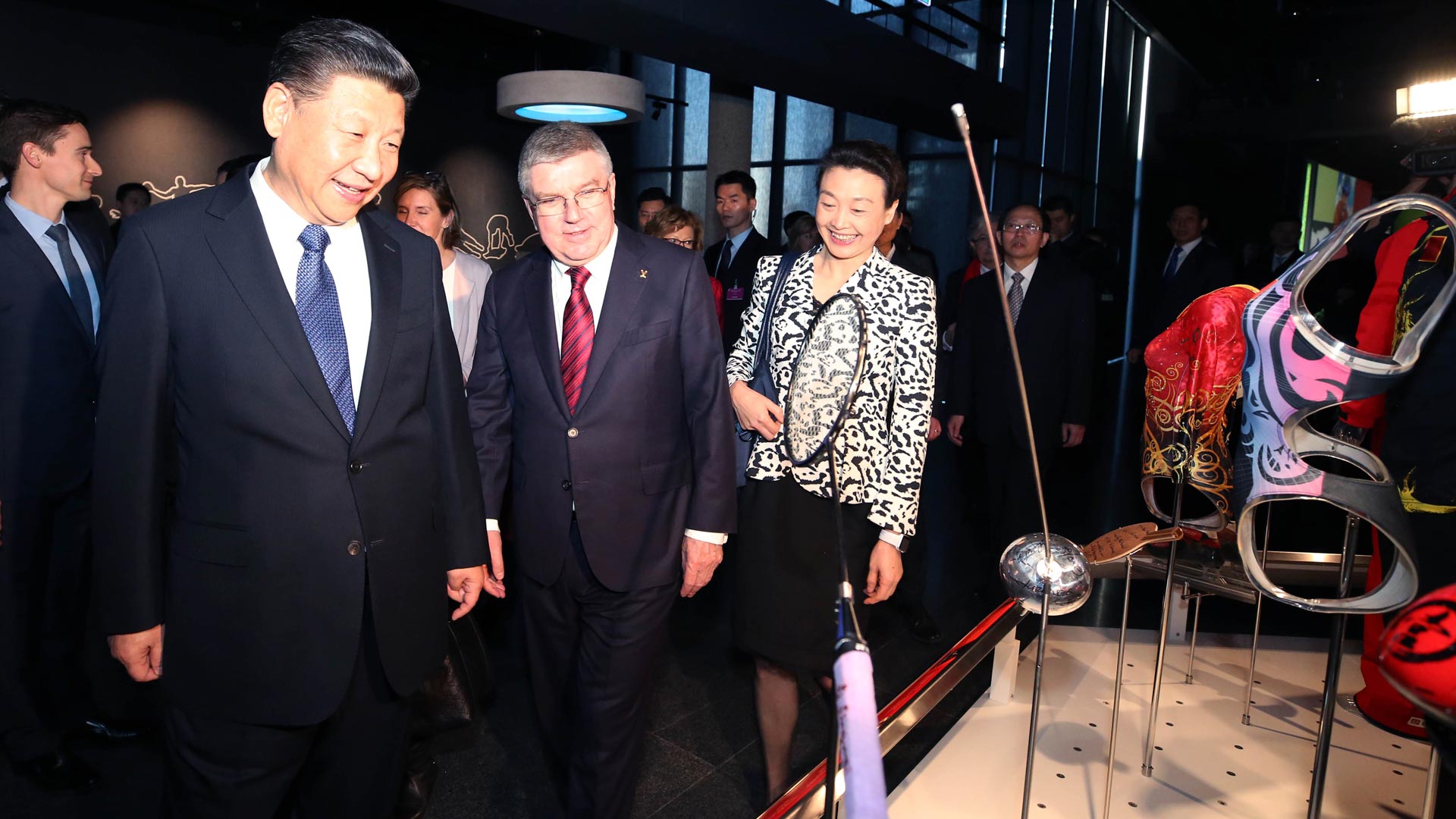 1月18日,國家主席習(xí)近平在瑞士洛桑國際奧林匹克博物館會(huì)見國際奧林匹克委員會(huì)主席巴赫。這是習(xí)近平在巴赫陪同下,參觀羽毛球世界冠軍李玲蔚用過的球拍。新華社記者 蘭紅光 攝2017-01-19