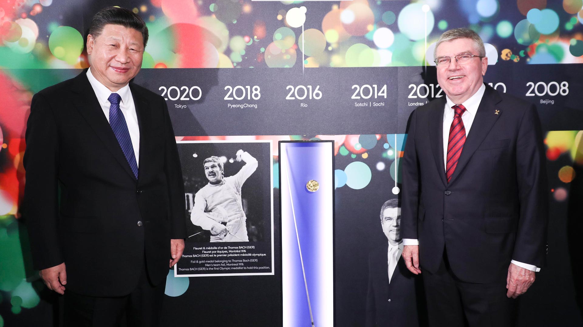 1月18日,國家主席習(xí)近平在瑞士洛桑國際奧林匹克博物館會(huì)見國際奧林匹克委員會(huì)主席巴赫。這是習(xí)近平在巴赫陪同下,參觀巴赫作為擊劍運(yùn)動(dòng)員參加奧運(yùn)會(huì)的照片。新華社記者 蘭紅光 攝2017-01-19