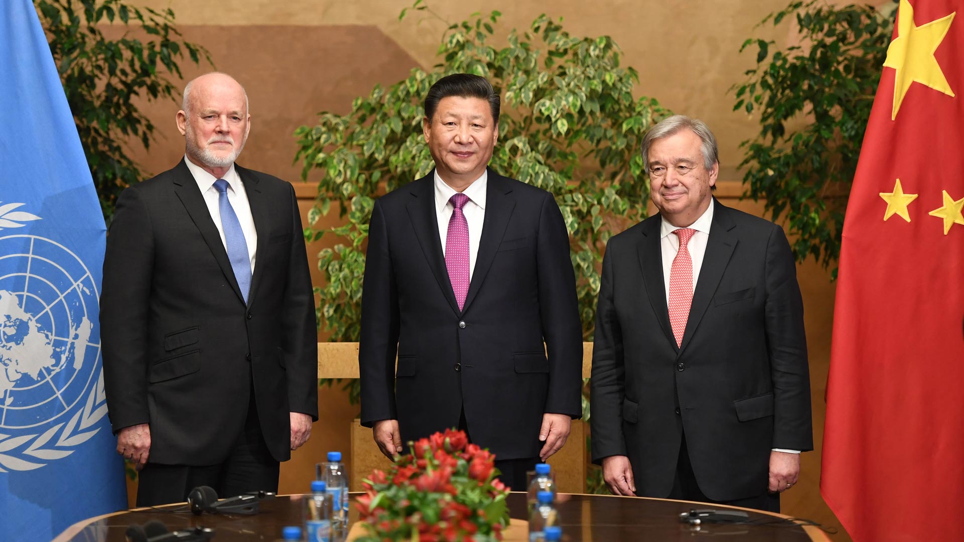 1月18日,國家主席習(xí)近平在瑞士日內(nèi)瓦萬國宮會(huì)見第71屆聯(lián)合國大會(huì)主席湯姆森和聯(lián)合國秘書長(zhǎng)古特雷斯。 新華社記者 蘭紅光 攝2017-01-19