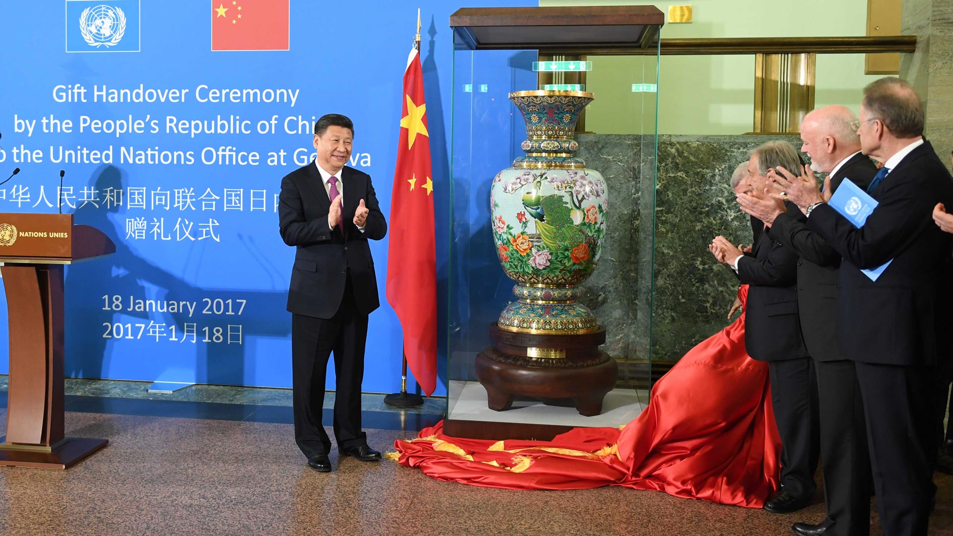 1月18日,國家主席習(xí)近平在瑞士日內(nèi)瓦萬國宮出席“共商共筑人類命運(yùn)共同體”高級(jí)別會(huì)議,并發(fā)表題為《共同構(gòu)建人類命運(yùn)共同體》的主旨演講。這是會(huì)議結(jié)束后,習(xí)近平出席中國向聯(lián)合國日內(nèi)瓦總部贈(zèng)禮儀式。新華社記者 張鐸 攝2017-01-19