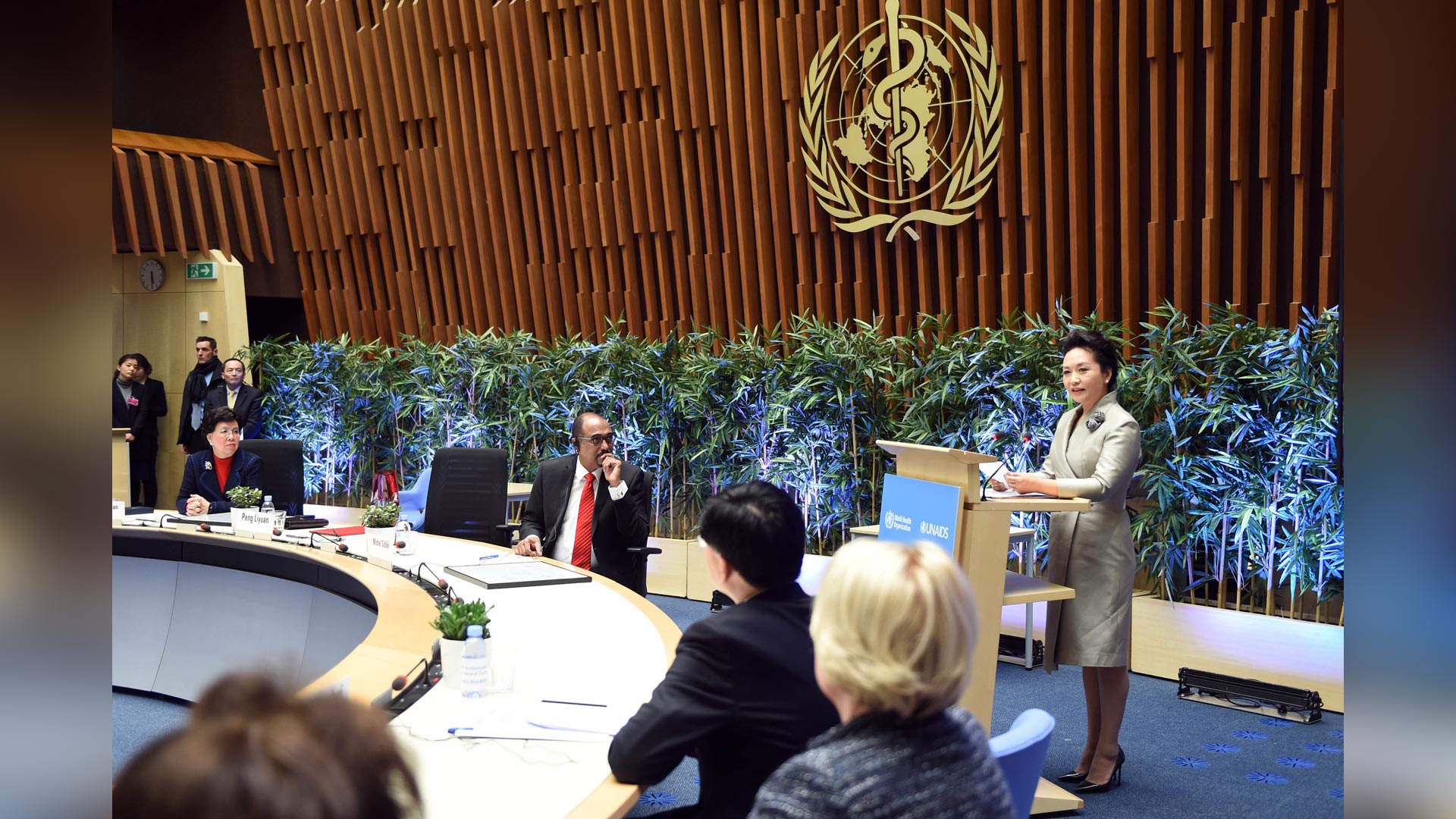 1月18日,國家主席習(xí)近平夫人、世界衛(wèi)生組織結(jié)核病和艾滋病防治親善大使彭麗媛應(yīng)世界衛(wèi)生組織總干事陳馮富珍和聯(lián)合國艾滋病規(guī)劃署執(zhí)行主任西迪貝邀請(qǐng),在瑞士日內(nèi)瓦出席為她舉行的親善大使任期續(xù)延暨頒獎(jiǎng)儀式。這是彭麗媛在儀式上致辭。新華社記者謝環(huán)馳攝2017-01-19