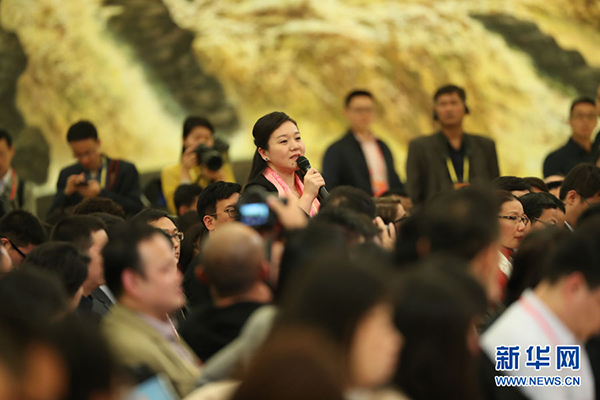 2017年10月17日下午,中國共產(chǎn)黨第十九次全國代表大會(huì)新聞發(fā)言人在人民大會(huì)堂三樓金色大廳舉行新聞發(fā)布會(huì),并回答中外記者提問。圖為新華社記者提問。新華網(wǎng) 翟子赫 攝