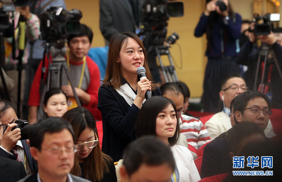 10月21日,十九大新聞中心舉辦記者招待會(huì),邀請(qǐng)中共中央統(tǒng)戰(zhàn)部常務(wù)副部長(zhǎng)張裔炯、副部長(zhǎng)冉萬(wàn)祥,中共中央對(duì)外聯(lián)絡(luò)部副部長(zhǎng)郭業(yè)洲介紹黨的統(tǒng)一戰(zhàn)線工作和黨的對(duì)外交往情況,并回答記者提問(wèn)。圖為經(jīng)濟(jì)日?qǐng)?bào)記者提問(wèn)。新華網(wǎng) 郝廣鵬攝