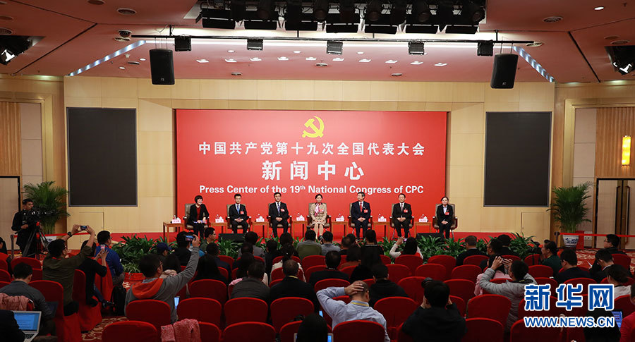 10月22日,十九大新聞中心在梅地亞中心二層新聞發(fā)布廳舉辦集體采訪活動,邀請教育領(lǐng)域代表談“教育綜合改革”。圖為集體采訪活動現(xiàn)場。新華網(wǎng) 郝廣鵬攝