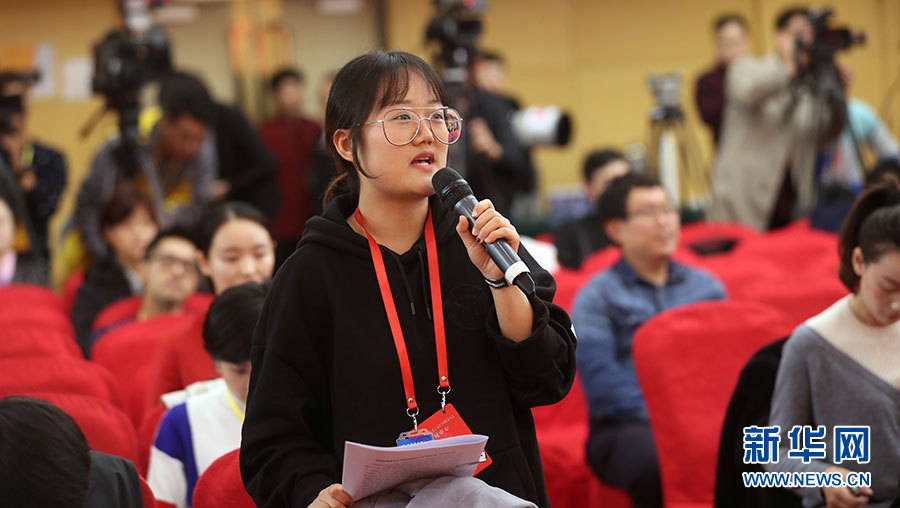 10月22日,十九大新聞中心在梅地亞中心二層新聞發(fā)布廳舉辦集體采訪活動(dòng),邀請(qǐng)教育領(lǐng)域代表談“教育綜合改革”。圖為人民日?qǐng)?bào)記者提問(wèn)。新華網(wǎng) 郝廣鵬攝