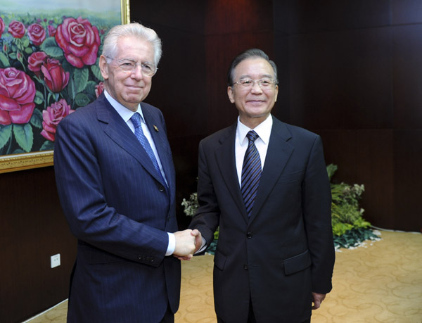 ????在會見蒙蒂時,溫家寶表示,一段時間以來,歐盟采取了若干重大舉措應對歐債問題,意大利積極推進財政改革和經(jīng)濟振興計劃,這些都讓歐洲和國際社會看到了希望,增添了信心。中方支持歐方作出更有成效的努力,倡議中歐探討在經(jīng)貿(mào)、投資、基礎設施、金融、高科技等領域開展大規(guī)模合作。意大利有燦爛的文化和很強的創(chuàng)新能力,在歐盟中發(fā)揮著重要影響。中方愿與意方加強協(xié)調(diào)合作,繼續(xù)應對國際金融危機,推動中意、中歐關系取得更大進展。