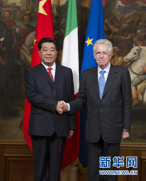 賈慶林首先轉(zhuǎn)達溫家寶總理的親切問候和良好祝愿,對蒙蒂總理和意政府推動發(fā)展對華友好關(guān)系表示贊賞。賈慶林說,中意是傳統(tǒng)友好國家,雙方堅持相互理解,尊重彼此重大關(guān)切,務實合作成果豐碩。在當前世界經(jīng)濟復蘇乏力、不穩(wěn)定和不確定因素增多的背景下,中意雙方應繼續(xù)發(fā)揮各自優(yōu)勢,發(fā)掘潛力,深化合作,攜手應對全球性挑戰(zhàn),實現(xiàn)互利共贏和共同發(fā)展。