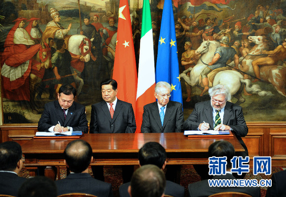 ????當地時間11月28日,中國全國政協(xié)主席賈慶林在羅馬和意大利總理蒙蒂共同出席中意兩國電信、新能源汽車等領域合作項目協(xié)議的簽字儀式。(來源:新華社記者 李學仁 攝)