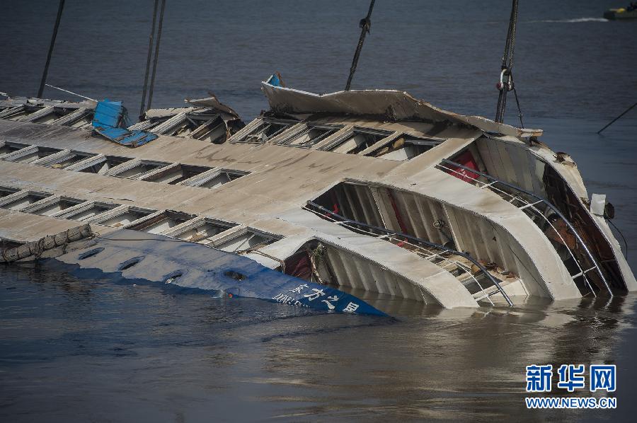 “東方之星”號游輪正在被扶正(6月5日攝)。當天8時30分左右,“東方之星”沉船正在被扶正,已露出頂部及四層和三層。 。 新華社記者 肖藝九 攝