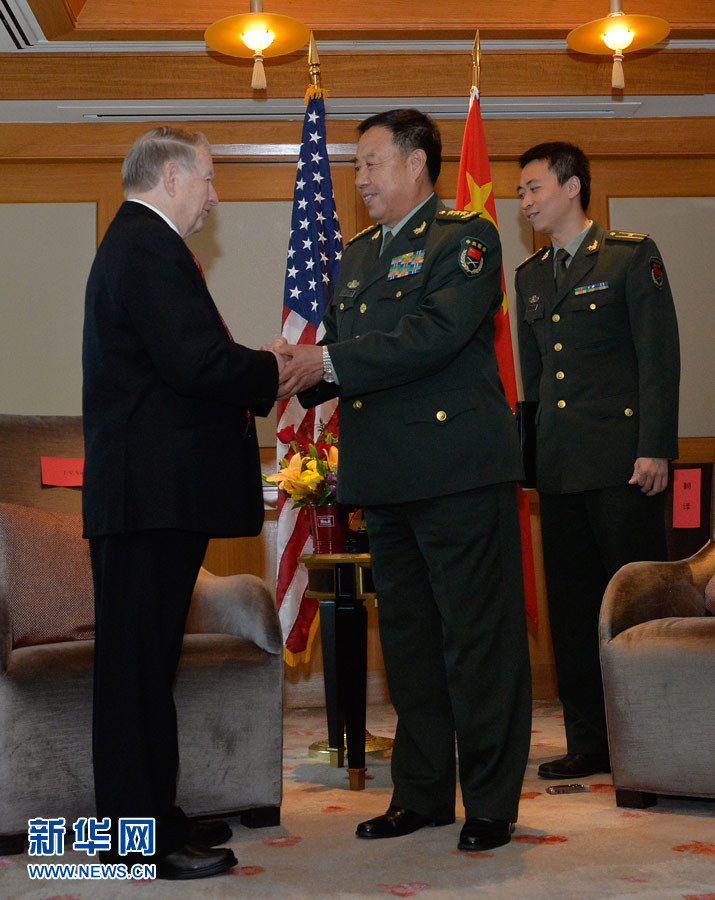 ??? 6月12日,正在美國訪問的中央軍委副主席范長(zhǎng)龍(中)在華盛頓接見飛虎隊(duì)老兵杰·溫雅德。 新華社記者鮑丹丹攝
