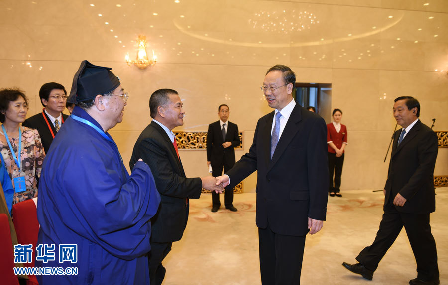 ?? 9月4日,紀念中國人民抗日戰(zhàn)爭暨世界反法西斯戰(zhàn)爭勝利70周年宗教界和平祈禱活動在北京舉行。這是中共中央書記處書記、全國政協(xié)副主席杜青林,全國政協(xié)副主席齊續(xù)春會見參加和平祈禱活動的宗教界代表。新華社記者 張領 攝