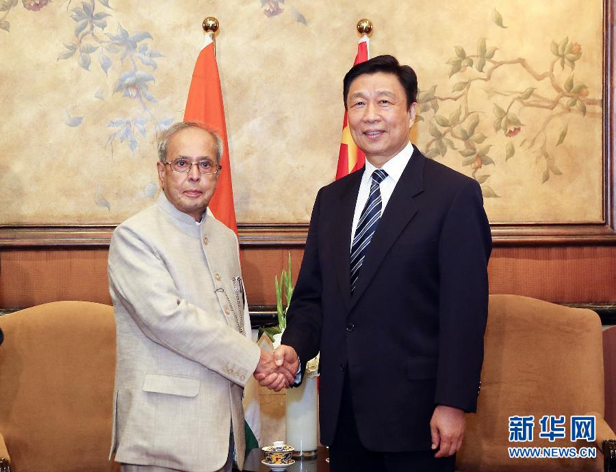 ??? 5月25日,國(guó)家副主席李源潮在北京會(huì)見印度總統(tǒng)慕克吉,共同出席由中國(guó)人民對(duì)外友好協(xié)會(huì)和印度駐華大使館舉辦的歡迎招待會(huì)。 新華社記者丁林 攝