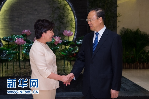 6月7日,中共中央書記處書記、全國政協(xié)副主席杜青林在澳門會見來華出席太湖世界文化論壇第四屆年會的吉爾吉斯斯坦副總理庫代別爾季耶娃。新華社記者 張金加 攝