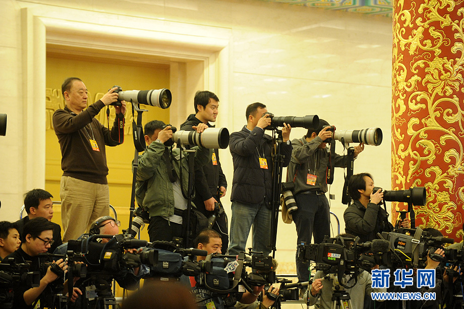 3月16日上午,國務院總理李克強在人民大會堂三樓金色大廳會見采訪十二屆全國人大四次會議的中外記者并回答記者提出的問題。圖為等待拍照的攝影記者。新華網(wǎng)/中國政府網(wǎng) 陳競超 攝