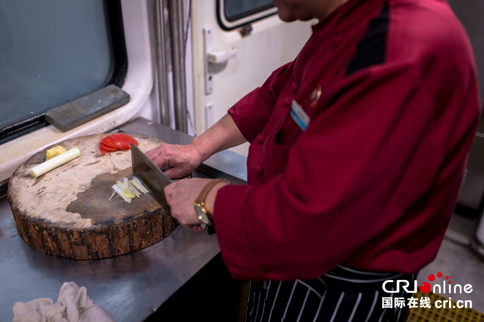 列車上的廚師和一般的餐廳廚師最大的區(qū)別在于“晃”,火車在運行中顛簸不斷,“最重要的是腿要分開,站成外八字,扎好馬步,隨著車廂晃動的方向,這樣才能穩(wěn)當(dāng)?!卑讕煾嫡f。
