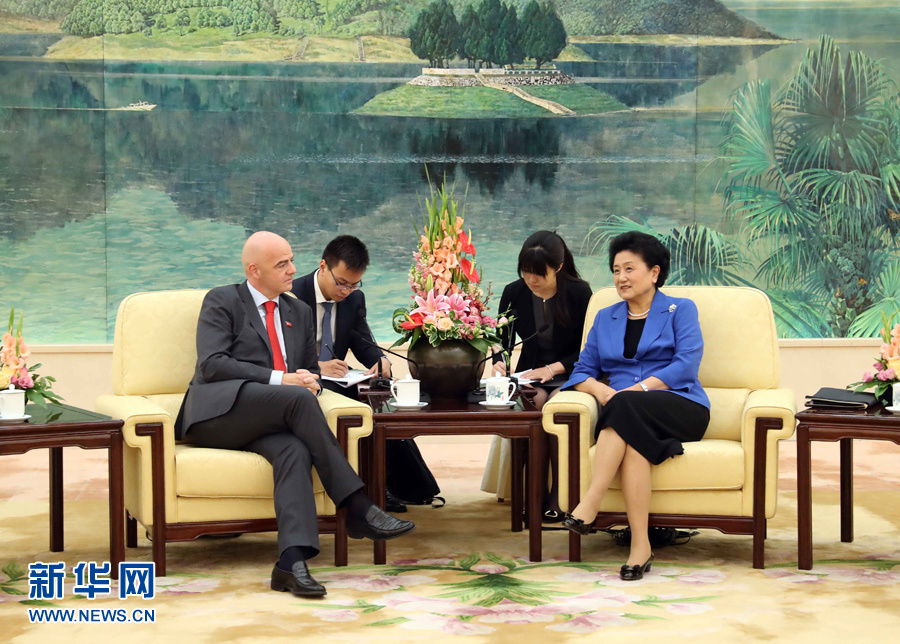 6月14日,國(guó)務(wù)院副總理劉延?xùn)|在北京人民大會(huì)堂會(huì)見來華訪問的國(guó)際足聯(lián)主席因凡蒂諾。 新華社記者劉衛(wèi)兵攝