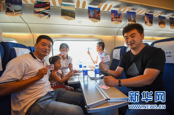 8月3日,在呼和浩特東站開往烏蘭察布的列車上,乘客們在展示加蓋紀念印章的車票。新華社記者 連振 攝