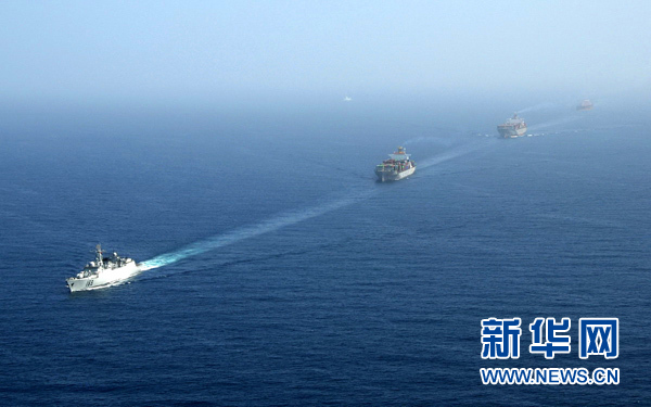 2009年1月6日,在中國海軍護(hù)航艦艇編隊(duì)武漢號導(dǎo)彈驅(qū)逐艦的帶領(lǐng)下,被護(hù)航的中國商船一字排開航行。 2009年4月28日,中國人民解放軍海軍第一批赴亞丁灣護(hù)航編隊(duì),圓滿完成護(hù)航任務(wù)后返回海南三亞某軍港。由武漢號導(dǎo)彈驅(qū)逐艦、??谔枌?dǎo)彈驅(qū)逐艦和微山湖號綜合補(bǔ)給艦組成的海軍首批護(hù)航編隊(duì),在124個日夜里連續(xù)航行33000多海里,為41批166艘船舶實(shí)施了伴隨護(hù)航,為46艘船舶提供了區(qū)域護(hù)航,成功救援了3艘遇襲外國船只,安全、順利、圓滿地完成了護(hù)航任務(wù)。新華社發(fā)