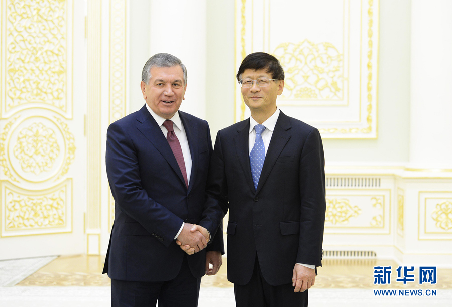 9月9日,中共中央政治局委員、中央政法委書記、中國和烏茲別克斯坦政府間合作委員會中方主席孟建柱(右)在塔什干會見烏總統(tǒng)米爾濟約耶夫?! ⌒氯A社記者沙達提攝