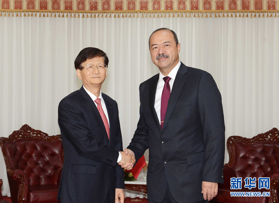 9月9日,中共中央政治局委員、中央政法委書記、中國(guó)和烏茲別克斯坦政府間合作委員會(huì)中方主席孟建柱(左)在塔什干會(huì)見(jiàn)烏總理、中烏政府間合作委員會(huì)烏方主席阿里波夫?! ⌒氯A社記者沙達(dá)提攝