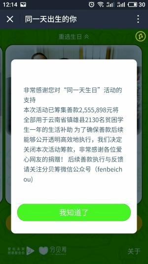 近日,“同一天生日”為貧困山區(qū)孩子籌款這一活動在朋友圈刷屏,但與此同時,被疑造假、信息有誤等聲音也出現(xiàn)在網(wǎng)端。對此,活動主辦方分貝籌創(chuàng)始人微博回應(yīng)稱,最初僅為測試傳播率發(fā)到朋友圈,因未詳細(xì)檢查孩子信息導(dǎo)致大家誤解。北京晨報記者發(fā)現(xiàn),昨天中午平臺顯示系統(tǒng)升級,已無法籌款。
