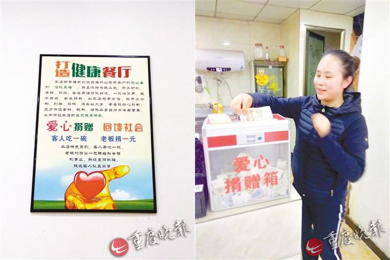 抄手店的店規(guī)(左)。老板張德蓉當(dāng)面存入捐款箱,有些顧客會(huì)額外多捐(右)。