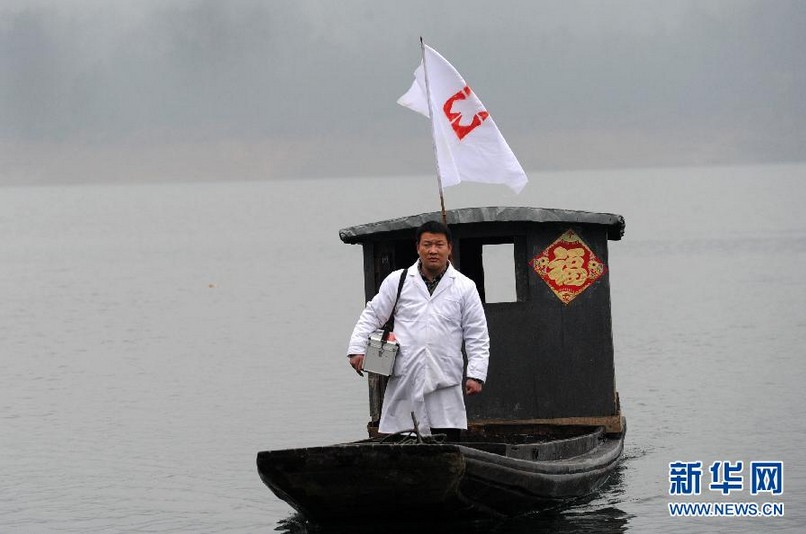 海島的東島岸邊,常年??恐粋€(gè)船屋,外面掛著“麻埠鎮(zhèn)齊山村海島衛(wèi)生站”的牌子。39歲的余家軍是船屋的主人,1999年衛(wèi)校畢業(yè)后回到齊山村,和妻子吳起嬌把家安到了船上,取名“海島衛(wèi)生站”,他也成了這里唯一的村醫(yī)。18年里,不論是白天黑夜、刮風(fēng)下雨甚至下雪,余家軍都劃著一條小木船,每日來往于東西兩島之間,為200多名村民看病,這條木船也被村民們親切地稱為“水上120”。