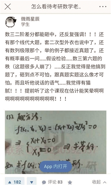 昨天上午,多名網(wǎng)友發(fā)微博爆料稱,2018年全國碩士研究生統(tǒng)一招生考試數(shù)學科目出現(xiàn)“神押題”,一位名為“李林”的教師在考前押題視頻中舉的例題與實際考研的考試試題十分相似。網(wǎng)友指出,李林押題“命中率”高達80%,甚至連超綱的二階差分都反復(fù)強調(diào)?!懊磕暄褐袔讉€題已經(jīng)很牛了,這位老師押中線代大題原題、證明題原題也就罷了,連超綱的二階微分都猜中,并且反復(fù)強調(diào)。”