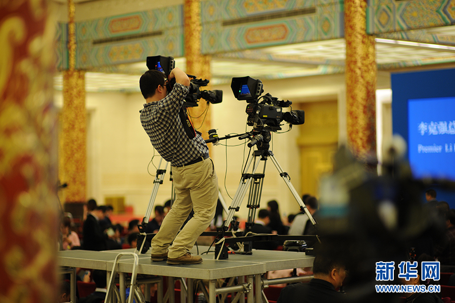 3月15日上午,國(guó)務(wù)院總理李克強(qiáng)在人民大會(huì)堂三樓金色大廳會(huì)見(jiàn)采訪(fǎng)十二屆全國(guó)人大五次會(huì)議的中外記者并回答記者提出的問(wèn)題。圖為記者會(huì)一角的攝影記者。新華網(wǎng)/中國(guó)政府網(wǎng)?孫韜 攝?