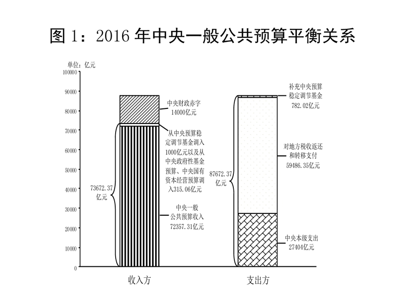 中央一般公共預(yù)算收入72357.31億元,為調(diào)整預(yù)算的100%,比2015年同口徑增長1.2%。加上從中央預(yù)算穩(wěn)定調(diào)節(jié)基金調(diào)入1000億元,從中央政府性基金預(yù)算、中央國有資本經(jīng)營預(yù)算調(diào)入315.06億元,收入總量為73672.37億元。中央一般公共預(yù)算支出86890.35億元(其中,中央本級(jí)支出27404億元,中央對(duì)地方稅收返還和轉(zhuǎn)移支付59486.35億元),完成調(diào)整預(yù)算的99.1%,增長4.5%。加上補(bǔ)充中央預(yù)算穩(wěn)定調(diào)節(jié)基金782.02億元,支出總量為87672.37億元。收支總量相抵,中央財(cái)政赤字14000億元,與預(yù)算持平。2016年中央預(yù)備費(fèi)預(yù)算500億元,實(shí)際支出146.1億元,剩余353.9億元全部轉(zhuǎn)入中央預(yù)算穩(wěn)定調(diào)節(jié)基金。2016年末,中央財(cái)政國債余額120066.75億元,控制在年度預(yù)算限額125908.35億元以內(nèi);中央預(yù)算穩(wěn)定調(diào)節(jié)基金余額2678.06億元(含通過收回中央財(cái)政結(jié)轉(zhuǎn)資金補(bǔ)充1501.83億元)。