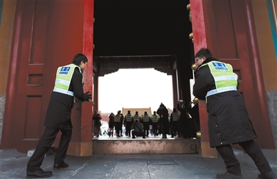 昨日,故宮,保安在進(jìn)行2017年最后一天的晚清場封門。新京報記者 浦峰 攝
