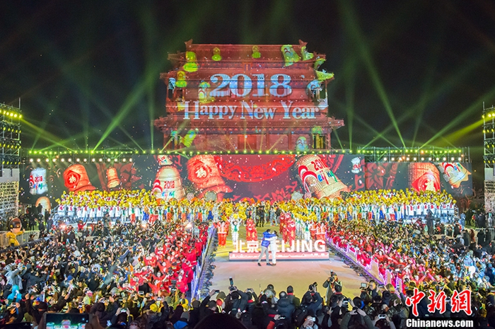 2018年1月1日,2018北京新年倒計時活動暨北京冰雪文化旅游節(jié)開幕式在北京永定門南廣場舉行。多國駐華使節(jié)、首都各行業(yè)的“北京榜樣”、北京旅游行業(yè)代表、中外游客、學(xué)生和市民代表共一千余人共同迎接新年的到來。中新網(wǎng)記者 富宇 攝