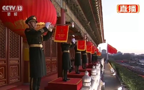 由軍樂團(tuán)八名禮號手在天安門城樓演奏《升旗號角》音樂,增加了升旗儀式的神圣感與儀式感。八名禮號手經(jīng)過嚴(yán)格挑選,從技術(shù)到體貌都是最優(yōu)秀的,未來一年基本不會輪換。