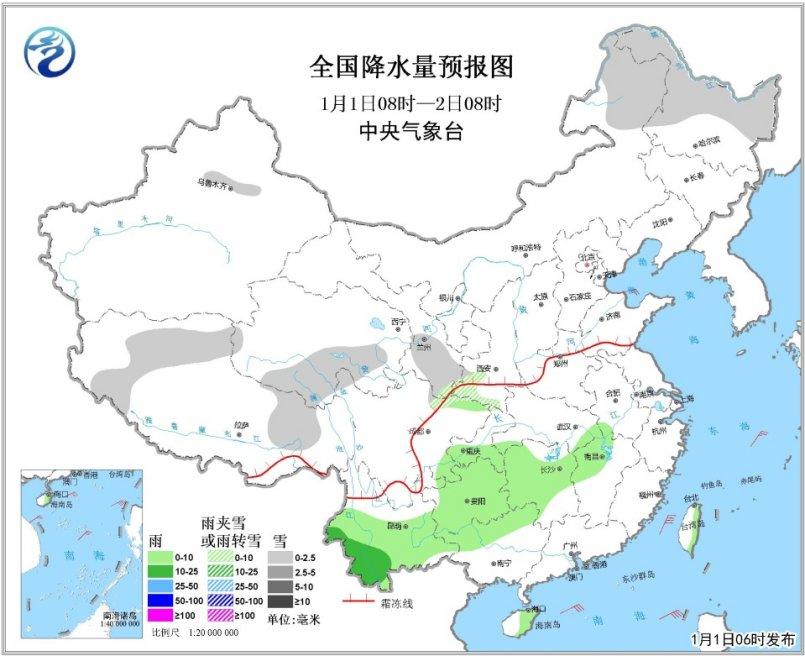 2日08時至3日08時,中東部有大范圍雨雪天氣。西藏東部、青海東部和南部、西北地區(qū)東部、華北南部、黃淮大部等地有小到中雪或雨夾雪;西南地區(qū)大部、江漢、黃淮東南部、江淮、江南北部、廣西西部等地有小到中雨,其中云南西南部的部分地區(qū)有大雨;內(nèi)蒙古中西部、遼東半島、黃淮東部、江淮東部等地有4~6級風(fēng)。南海東部有6~8級、陣風(fēng)9~10級大風(fēng)。
