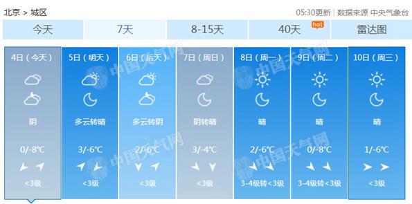 今天氣溫將處于冰點(diǎn)以下,明起稍有回升。北京市氣象臺預(yù)計(jì),今晨上班時(shí)多云,北轉(zhuǎn)南風(fēng)二三間四級,-5~-3℃;白天多云轉(zhuǎn)陰,北轉(zhuǎn)南風(fēng)二三間四級,最高氣溫僅0℃,為本周最低點(diǎn);夜間陰轉(zhuǎn)多云,西部山區(qū)有零星小雪,南轉(zhuǎn)北風(fēng)一二級,最低氣溫-8℃,晝夜溫差達(dá)到8℃。明天開始至周日最高氣溫將回升到2~3℃,但到下周初又將再次回落至冰點(diǎn)。