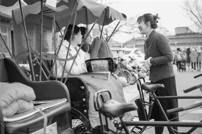應(yīng)聘成功后,經(jīng)過(guò)前期培訓(xùn),王雪宜1月1日正式上崗。聊起這幾天的收獲,她表示,這里依舊有許多老北京的影子,而蹬車的大爺們不僅騎車騎得溜,還能講好幾國(guó)語(yǔ)言。