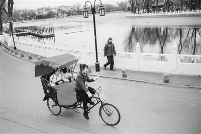 1月4日,北京什剎海景區(qū),車隊(duì)為每一個(gè)游客都準(zhǔn)備了毯子御寒。圖為王雪宜為兩名年輕游客鋪完毯子后交流今天的行程路線。