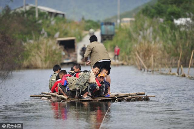 公路被淹,依靠竹筏出行。