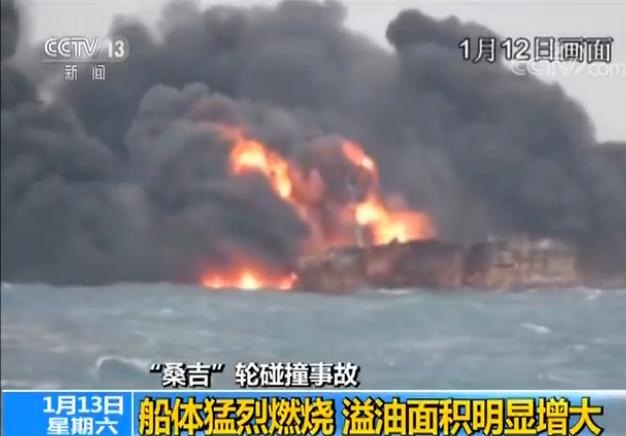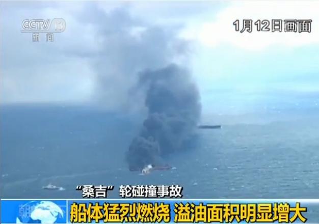 昨天(12日),央視記者登上國(guó)家海洋局海監(jiān)飛機(jī),在空中勘察“桑吉”輪碰撞事故現(xiàn)場(chǎng)。記者發(fā)現(xiàn),桑吉輪船身猛烈燃燒,溢油情況比前兩天明顯增多,火勢(shì)已經(jīng)蔓延到海面,桑吉輪船體傾斜嚴(yán)重,非常脆弱。