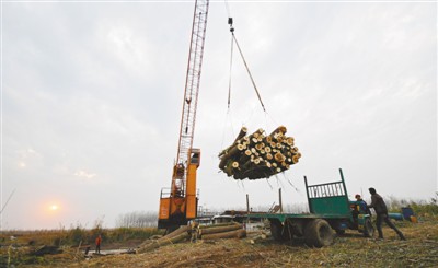 2017年11月27日,南洞庭湖自然保護(hù)區(qū)核心區(qū)內(nèi),機(jī)械吊臂將被清理的歐美黑楊運(yùn)上貨車?!⌒氯A社記者 李 尕?cái)z