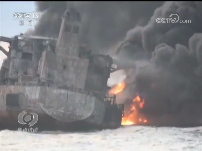 1月14日12點(diǎn)30分,“桑吉”輪突然猛烈燃燒,火焰最高達(dá)1000米,船體開始下沉。16點(diǎn)45分,“桑吉”輪沉沒。