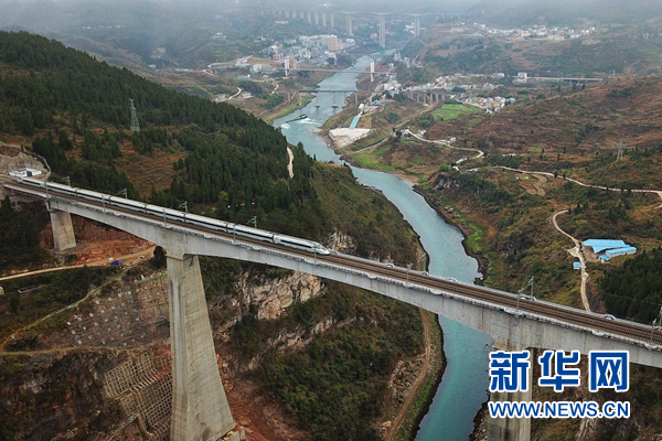 1月25日,渝貴鐵路從貴陽北到重慶西的D8592次首發(fā)動(dòng)車經(jīng)過遵義市境內(nèi)的烏江大橋。 當(dāng)日,設(shè)計(jì)時(shí)速200公里的渝貴鐵路全線開通運(yùn)營。新華社記者 劉續(xù)攝