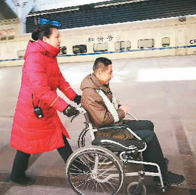 來(lái)自黑龍江齊齊哈爾的趙大哥在北京站工作人員幫助下進(jìn)站。葉聰 攝