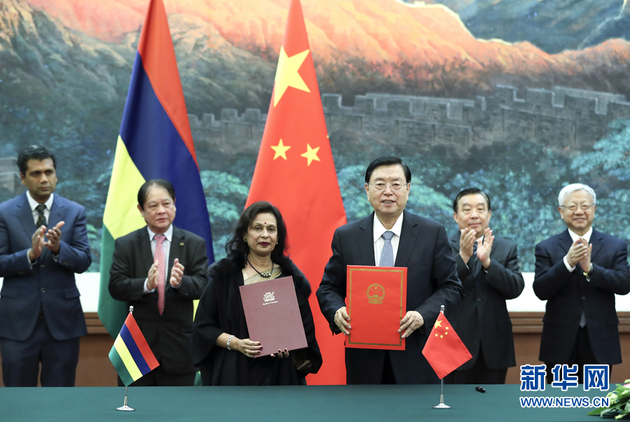 2月2日,全國(guó)人大常委會(huì)委員長(zhǎng)張德江在北京人民大會(huì)堂與毛里求斯國(guó)民議會(huì)議長(zhǎng)哈努曼吉舉行會(huì)談。這是雙方會(huì)談前共同出席中國(guó)全國(guó)人大與毛里求斯國(guó)民議會(huì)合作諒解備忘錄的簽字儀式。新華社記者 龐興雷 攝