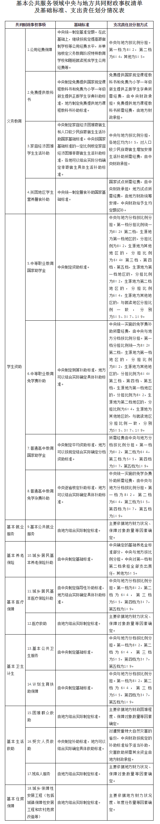 附:基本公共服務(wù)領(lǐng)域中央與地方共同財(cái)政事權(quán)清單及基礎(chǔ)標(biāo)準(zhǔn)、支出責(zé)任劃分情況表。來(lái)自中國(guó)政府網(wǎng)