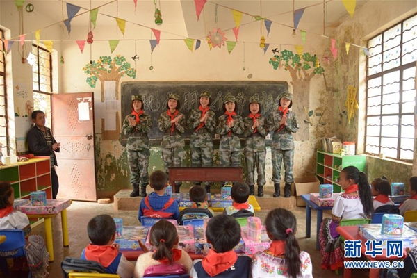 第75集團(tuán)軍某特戰(zhàn)旅指揮通信連大學(xué)生女兵到駐地甸沙鄉(xiāng)草海子小學(xué)支教(2017年6月1日攝)。新華社發(fā)(張正舉 攝)