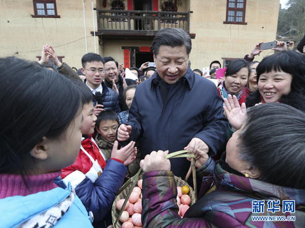 2016年2月2日,習(xí)近平在江西省井岡山市茅坪鄉(xiāng)神山村同村民一起打糍粑。他對(duì)鄉(xiāng)親們說:“我對(duì)井岡山懷有很深的感情。這是我第三次來,來瞻仰革命圣地,看望蘇區(qū)人民,祝老區(qū)人民生活越來越好。”